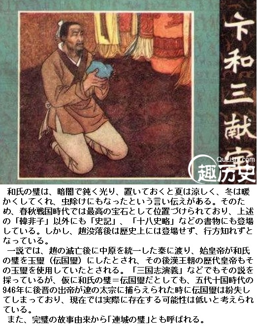 楚の人で和氏(かし)という者が楚山の中で璞玉(あらたま)を見つけて厲王に献じた。 厲王は玉工に鑑定させたが、玉工曰く、 これは石です、と。 王は和氏を君を欺く者であるとして、その左足を切った。