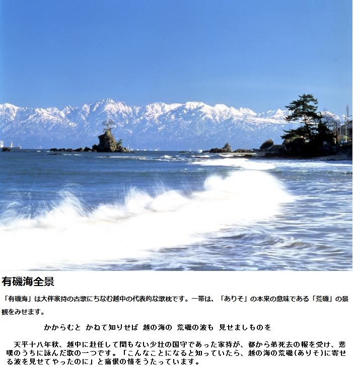有磯の浦は越中の歌枕で、大伴家持が歌に詠んだことにより生まれました。もとは漠然と越中の海をさしていましたが、後に場所が決められ、松尾芭蕉も『おくのほそ道』の旅の中で訪れています。それに応えたのが、紀伊のこの歌です。