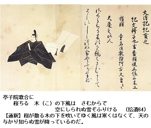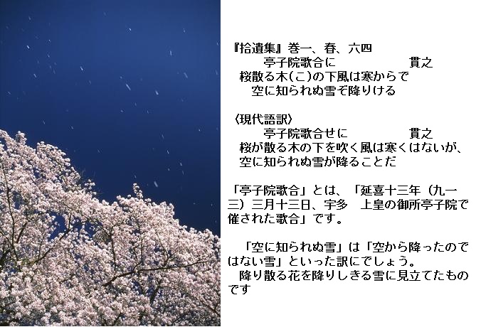○櫻散る木の下風は寒からで:桜散る木の下風は寒からで空に知られぬ雪ぞ降りける(拾遺集 春 紀貫之)