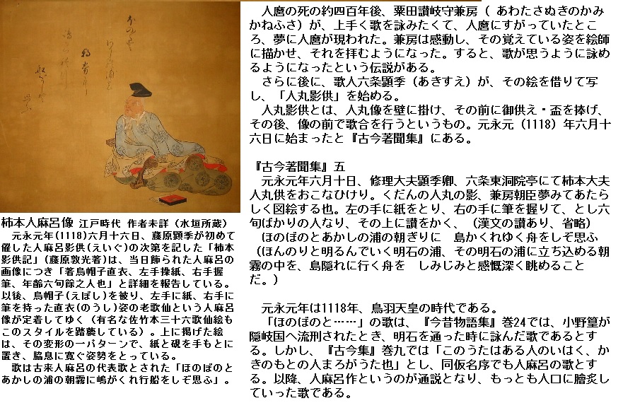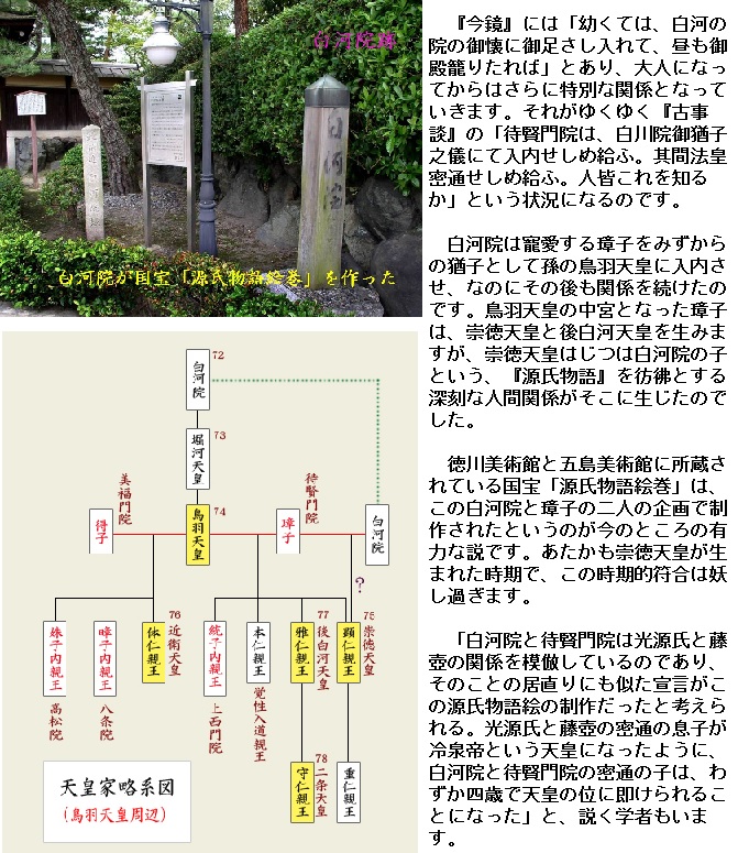 ※白河院が大堰川に行幸した際、漢詩・和歌・管弦の三つの船を川に浮かべ、その道に優れた人を乗せました。ところが、経信卿が遅れて姿を見せなかったので、院の機嫌が大変悪くなりました。しばらく待っているうちに経信卿参上。詩でも、歌でも、音楽でもどの道にも通じている人でしたので、経信卿は水際に膝まづいて、「おおい、どの舟でもかまわない、お乗せ下され」といいました。その場においては、これほど誇らしく、見事な振る舞いはありません。