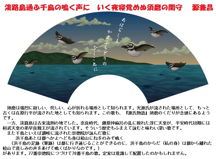 ※作者藤原俊成は、西行と並んで後鳥羽上皇に賞賛されたように、平安時代末を代表する歌人でした。その歌はやさしく、技巧に走らず自分の心の内を語っていく抒情的です。