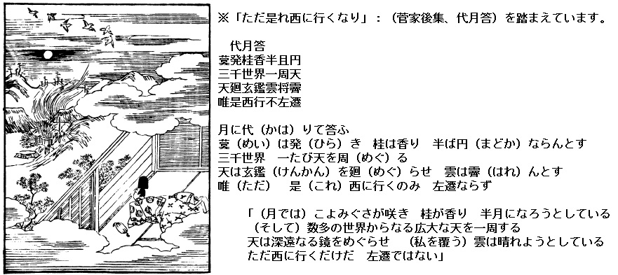 ※鳥羽天皇の北面の武士(天皇を護る近衛兵)というエリート職を捨て、俗世を捨てた自分。それと日の光を見ることなく、いつも暗い夜空に輝いている月に相通じるものを感じたのかもしれません。鳥羽天皇に出家を願い出る時には、こんな歌を詠んでいます。