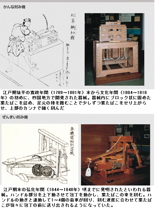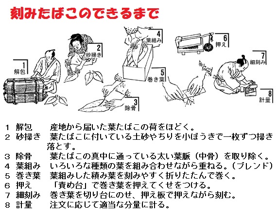それが、徳川4代将軍・家綱の時代である明暦年間(1655〜1658年)以降には、町中に「たばこ」のみを扱う専門の店舗=「たばこ屋」が見受けられるようになり、そこここに「細刻みたばこ」の製造・販売を専業とする店が増加します。通常、家族単位で営まれたそれらの「たばこ屋」では、おかみさん(=かか)が葉たばこの下準備をし、主人(=とと)が葉たばこを刻む“かかぁ巻き ととぅ切り”と呼ばれる形態がとられていました。日本ならではの精巧な技術力から生みだされた「細刻みたばこ」が、世に現れたのは、江戸時代中期(18世紀中頃)のことです。「たばこ」には当初、粗く刻まれた葉たばこが用いられていましたが、それがだんだんと細く刻まれるようになり、やがては毛髪のごとく細く刻まれたことで、名称とともに広く普及していきました。これにより日本では、世界でも例をみない独自の喫煙方法が確立されることとなったのです。