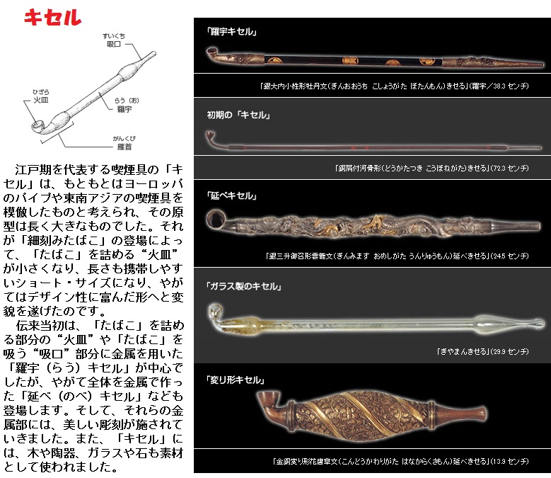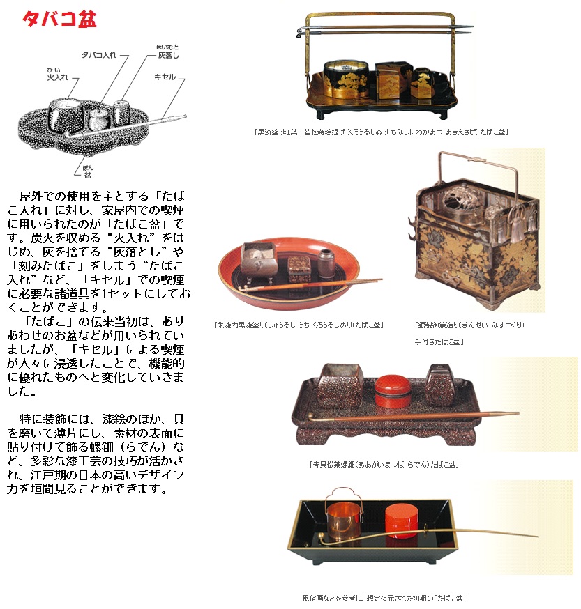 「細刻みたばこ」による喫煙が定着すると、日本人は喫煙具のなかに美を求めるようになります。使用する人の階層やTPO(Time〈時間〉、Place〈場所〉、Occasion〈場合、Opportunityと使われることもある〉の頭文字をとって、「時と場所、場合に応じた方法・態度・服装等の使い分け」を意味する和製英語)に応じてさまざまに作られた江戸期を代表する喫煙具の数々が作られました。
