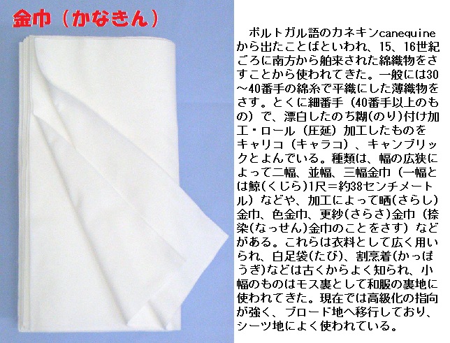「金巾(カナキン・カネキン)」とは、金巾木綿ともいわれ、細めの単糸を使って平織りにて緻密に織った薄手の綿織物です。あまり衣料には使われず、カーテン・旗・エプロンといったものなどに主に使われます。