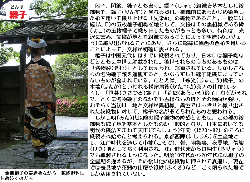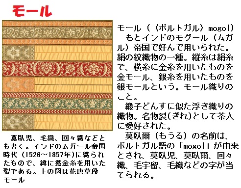 正徳2(1712)年頃に成った寺島良安の『和漢三才図会』に「按莫臥爾天竺国名、所出之綺、似緞閃而有小異、本朝所織者亦不劣」とあり、インドのモゴル(ムガール)帝国(1526~1857)の所産で、緞子(ドンス)に似ているが少し異なるとしています。わが国には戦国時代から桃山時代にかけて、南蛮貿易によって舶載されたといいます。緞子も地名Damask(ダマスク、現在のダマスカス)の音訳で日本には中国から十五世紀早々に入ってきたと言います。