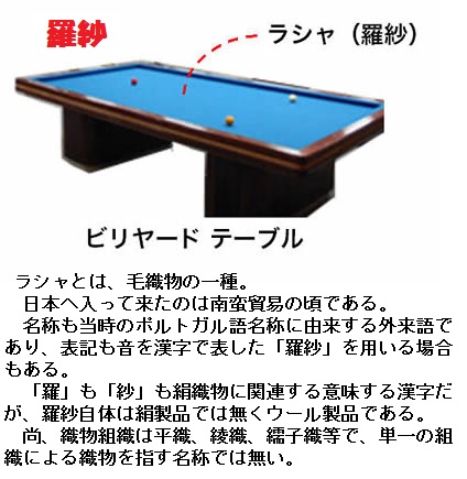 江戸時代末期から明治初年にかけて、外人の妾のことを「ラシャメン」と言いましたが、このラシャは羅紗のことです。現代ではVonnel(ボンネル)やExlan(エクスラン)などの化学繊維に圧倒されています。