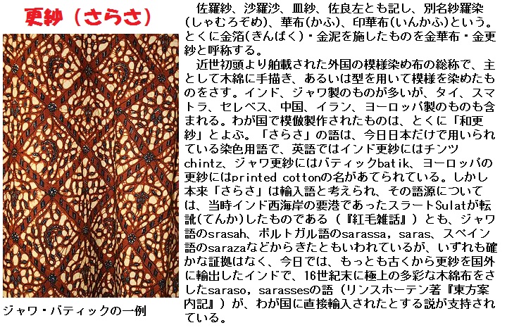 サラサ(saraça、ポルトガル語)は古代ジャワ語で「まんべんなく撒布した」の意で、ポルトガル語から入ったと言われています。