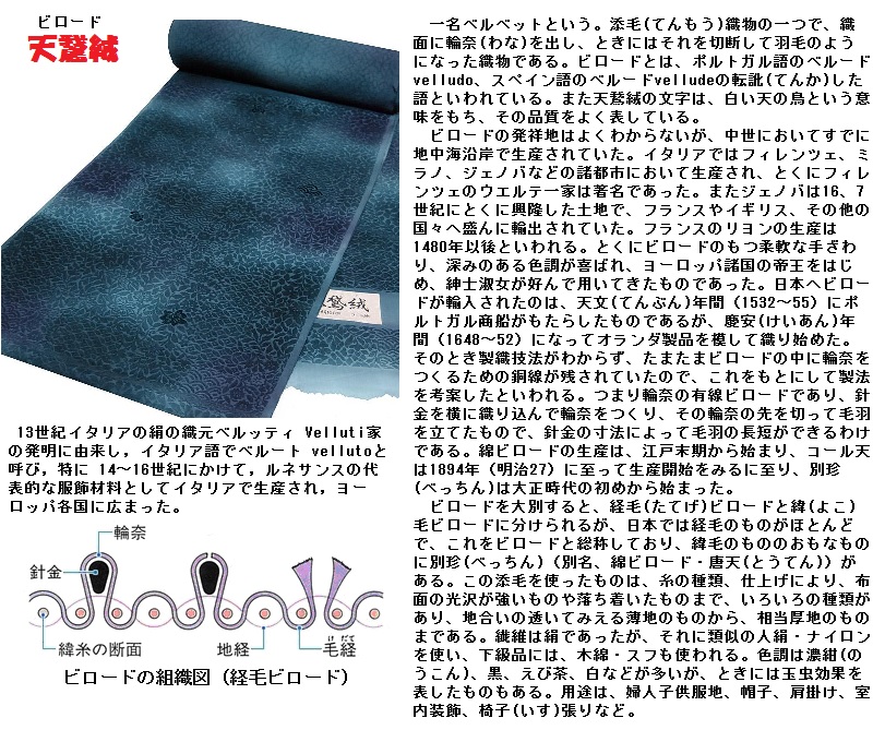 ビロウド(ポルトガル語: veludo、スペイン語: velludo)は鵞鳥の羽に似て光沢があるので天鵞絨(てんがじゅう)の漢字が当てられました。 柔らかで上品な手触りと深い光沢感が特長で、フォーマル・ドレスやカーテンに用いられます。レーヨンやシルクが一般的で、縫いずれし易く、きれいに縫製するには高度な技術が必要です。英語のベルベット(velvet)です。江戸時代には既に京都で生産されていたらしく、西鶴は雪を頂いた富士山を「白いビロード」にたとえているそうです。当時は高級品で一般庶民は身に着けることも出来ませんでした。