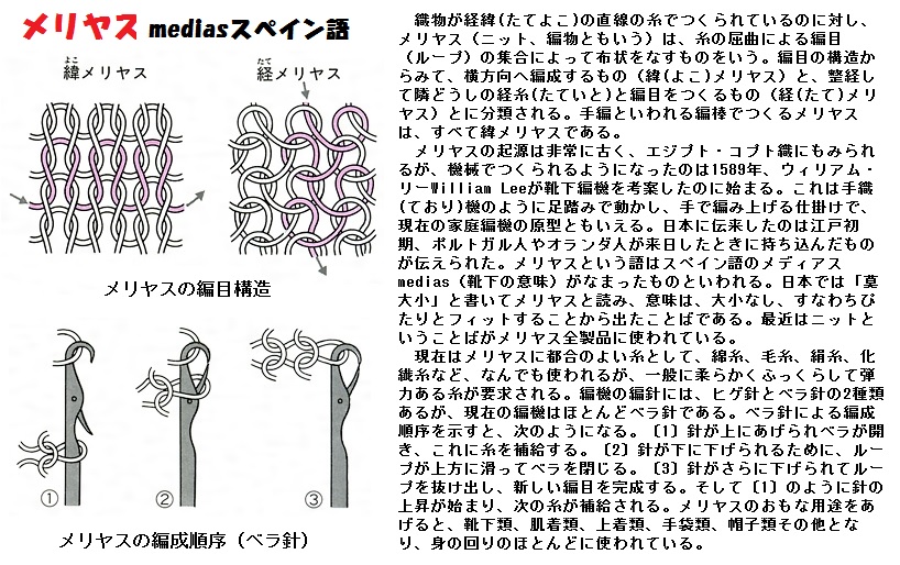 当時、メリヤスという言葉は靴下の意味で使われていたことが、以下のよう な古書の記述からもわかます。