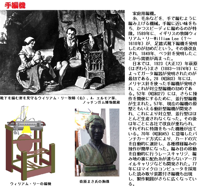 古代、魚をとる網やカゴやむしろなどに原型があり、英語でメリヤスをHOSIERY(ホーズ)といいます。ホーズは「靴下」の意味であり、編物の歴史は靴下から始まったということが分かります。1589年イギリスのウイリアム・リーが靴下機を発明したのが今日の編物(ニット)の発端となりました。メリヤス編機が日本に入ってきて、靴下が作られるようになったのは明治になってからです。そして、メリヤスがニットといわれ、織物と肩を並べるまでに発展し、衣料分野で大きな割合を占めるようになったのは戦後になってからのことです。