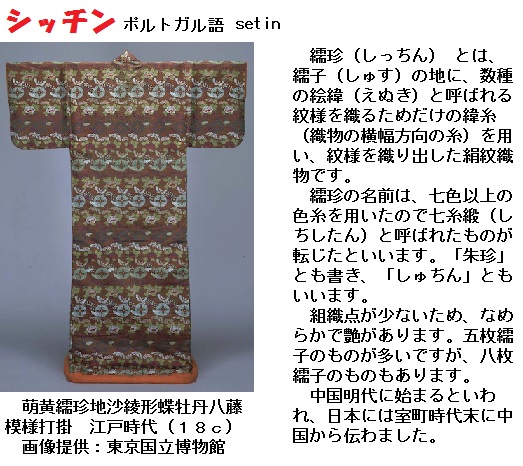 シッチン(ポルトガル語、setin)は中国の七糸緞(シチンタン)の略で、日本では繻珍とポルトガル語から直接ではなく中国語を介して入ったものでしょう。現代satijn(オランダ語、サテン)と言われているものと同じです。