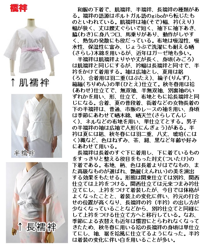 襦袢の漢字は当て字で、ポルトガル語の「ジバン」か、その古形「ジュバン」の転訛だといいます。Gibão(ジバン、ジュバン)は「袖の広い上着」を意味するアラビア語の「jubbeh(ジュッバ)」が語源となるそうです。日本の下着は白無垢の対丈仕立てでしたが、南蛮人によって襦袢がもたらされた16世紀頃からは、丈の短い襦袢が流行し、腰あたりまでの「半襦袢」、身丈ほどの「長襦袢」などが作られました。