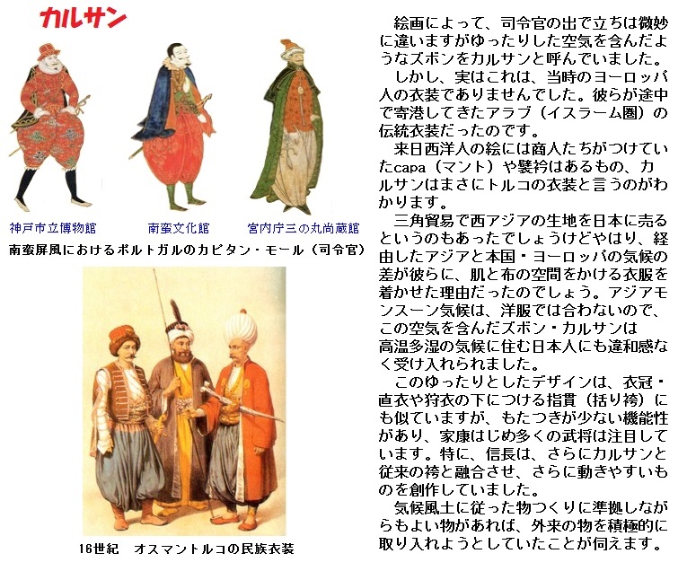 軽衫(カルサン)はズボンの一種で、ポルトガル語のカルソンcalção(半ズボンの意)に由来します。16~17世紀,スペインを中心に西欧で,詰物を入れて大きくふくらませた短いズボン(英語でトランクホーズ)が流行し,南蛮貿易に伴って日本にも渡来しました。