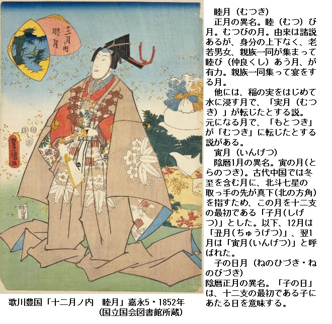 1月の別称を睦月と言います。今日の日本では新暦(グレゴリオ暦)の1月もそう呼ぶことがあります。睦月の語源は諸説ありますが、最も有力なものは1月は年始であり、親族が集まって親睦を図る月であることから睦び月、それが転じたというものです。それ以外には、稲の実を水に浸す月、「実月」が変化したという説があります。