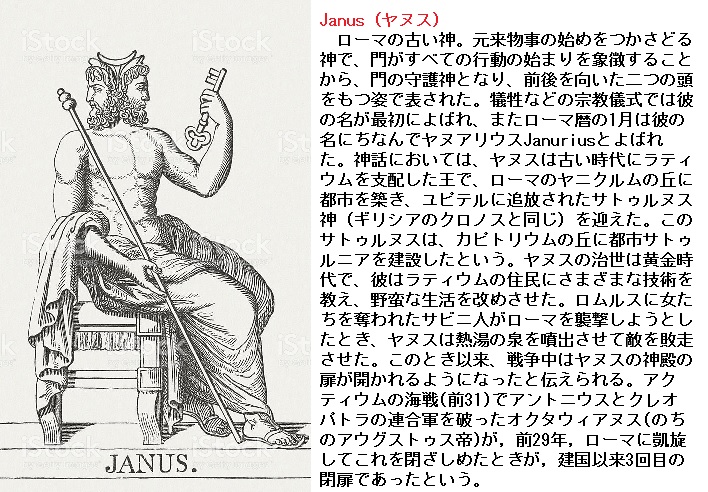 英語のJanuaryは、ローマ神話の出入り口とドアの神Janus(ヤヌス)に因むものです。年の入り口にあたることから、ヤヌスの月となりました。