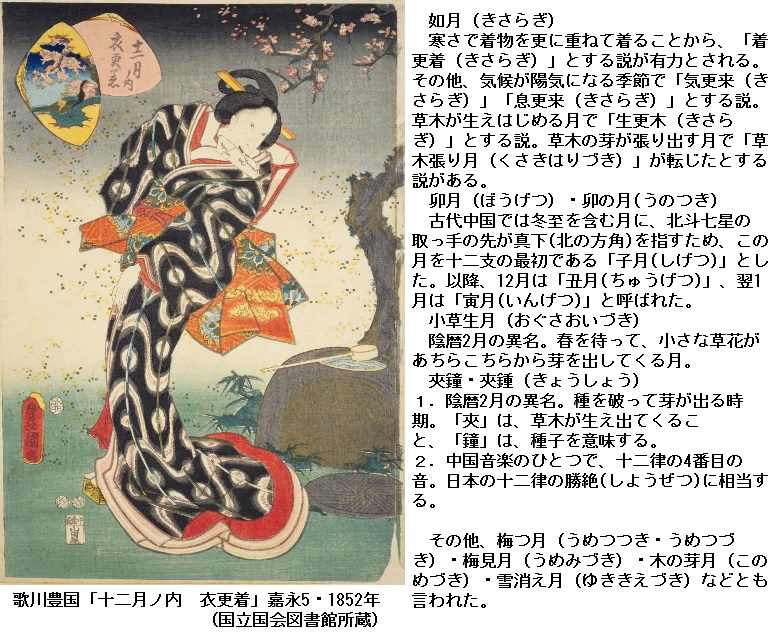 旧暦2月を如月(きさらぎ、絹更月、衣更月と綴ることもある)と呼び、現在では新暦2月の別名としても用います。「如月(じょげつ)」は中国での二月の異称をそのまま使ったもので、日本の「きさらぎ」という名称とは関係がありません。「きさらぎ」という名前の由来には諸説あります。旧暦二月でもまだ寒さが残っているので、衣(きぬ)を更に着る月であるから「衣更着(きさらぎ)」、草木の芽が張り出す月であるから「草木張月(くさきはりづき)」、前年の旧暦八月に雁が来て、更に燕が来る頃であるから「来更来(きさらぎ)」、陽気が更に来る月であるから「気更来(きさらぎ)」などがあります。