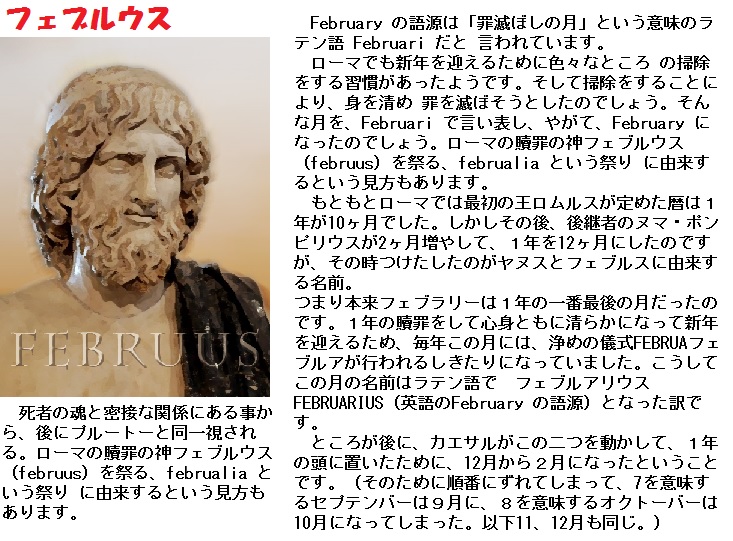 2月はグレゴリオ暦で年の第2の月に当たり、通常は28日、閏年では29日となります。他の月の日数が30または31日なのに対して、2月だけ28または29日なのは、アウグストゥスが紀元前8年、8月の日数を30日から31日に変更し、そこで不足した日数を2月から差し引いたためであるといいます。それ以前のローマ暦では、年初は3月であったため、単に年末の2月から日数を差し引いただけのことです。欧米での呼び名であるFebruaryはローマ神話のフェブルウス (Februus) をまつる祭りから取ったと言われています。
