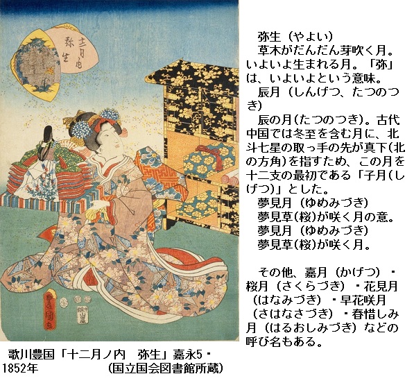 旧暦3月を弥生(やよい)と呼び、現在でも新暦3月の別名としても用います。弥生の由来は、草木がいよいよ生い茂る月「木草弥や生ひ月(きくさいやおひづき)」が詰まって「やよひ」となったという説が有力で、これに対する異論は特にありません。