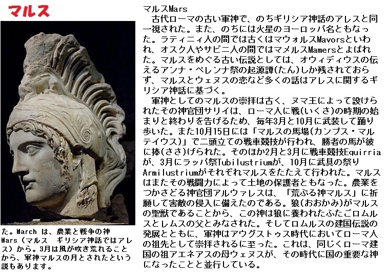 古代ローマの暦(ユリウス暦より前)においては、年の最初の月は現在の3月にあたります。3月(さんがつ)は、グレゴリオ暦で年の第3の月に当たり、31日間あります。英語での呼び名であるMarchはローマ神話のマルス (Mars) の月を意味するマルティウス(Martius)から取ったものです。