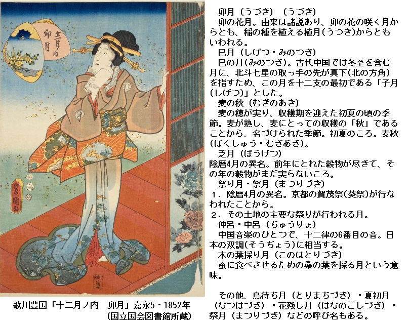 旧暦4月を卯月(うづき)と呼び、現在では新暦4月の別名としても用います。卯月の由来は、卯の花が咲く月「卯の花月(うのはなづき)」を略したものというのが定説となっています。しかし、卯月の由来は別にあって、卯月に咲く花だから卯の花と呼ぶのだとする説もあります。「卯の花月」以外の説には、十二支の4番目が卯であることから「卯月」とする説や、稲の苗を植える月であるから「種月(うづき)」「植月(うゑつき)」「田植苗月(たうなへづき)」「苗植月(なへうゑづき)」であるとする説などがあります。他に「夏初月(なつはづき)」の別名もあります。