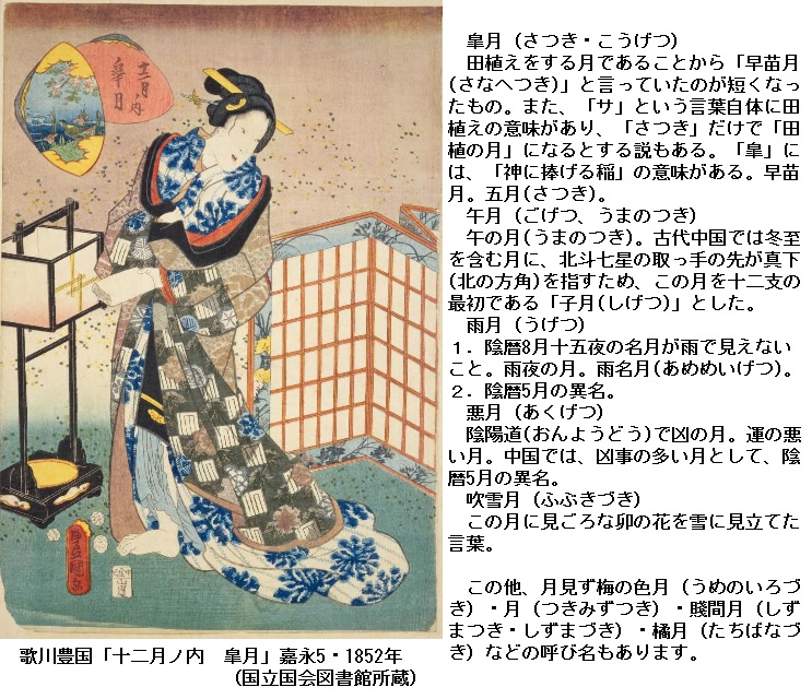 旧暦5月皐月(さつき)と呼び、現在では新暦5月の別名としても用います。「さつき」は、この月は田植えをする月であることから「早苗月(さなへつき)」と言っていたのが短くなったものです。また、「サ」という言葉自体に田植えの意味があるので、「さつき」だけで「田植の月」になるとする説もあります。