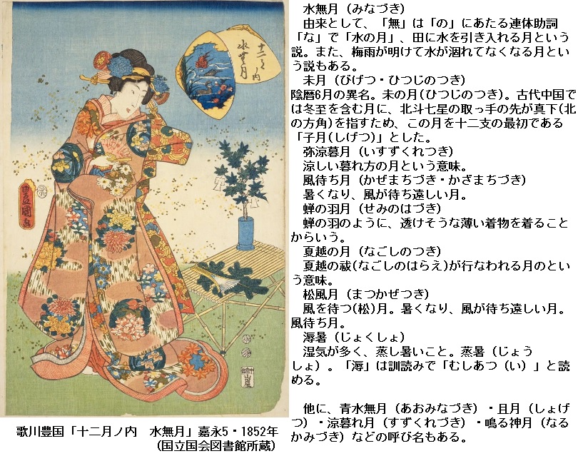 陰暦6月を水無月(みなづき)といいます。水無月の「無」は「の」という意味の連体助詞「な」であり「水の月」であるとする説が有力です。神無月の「無」が「の」であり、「神の月」であるということと同じです。田植が終わって田んぼに水を張る必要のある月「水張月(みづはりづき)」「水月(みなづき)」であるとする説もあります。文字通り、梅雨が明けて水が涸れてなくなる月であると解釈されることもあるそうですが、これは俗説だといいます。他に、田植という大仕事を仕終えた月「皆仕尽(みなしつき)」であるとする説、などもあります。