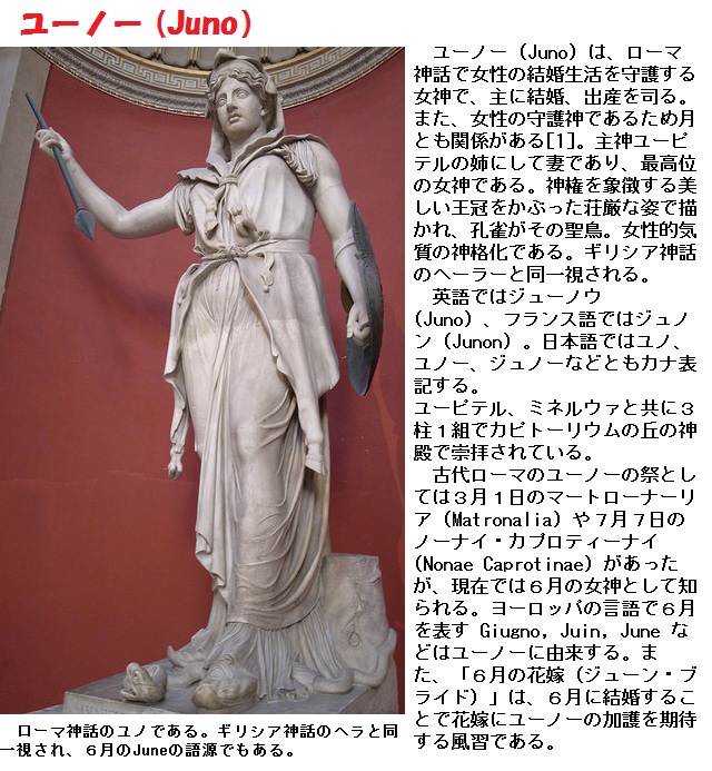 英語名ではJuneというのはローマ神話のユピテル(ジュピター)の妻ユーノー(ジュノー)から取られたといいます。ユーノーが結婚生活の守護神であることから、6月に結婚式を挙げる花嫁を「ジューン・ブライド」(June bride、6月の花嫁)と呼び、この月に結婚をすると幸せになれるといわれています。