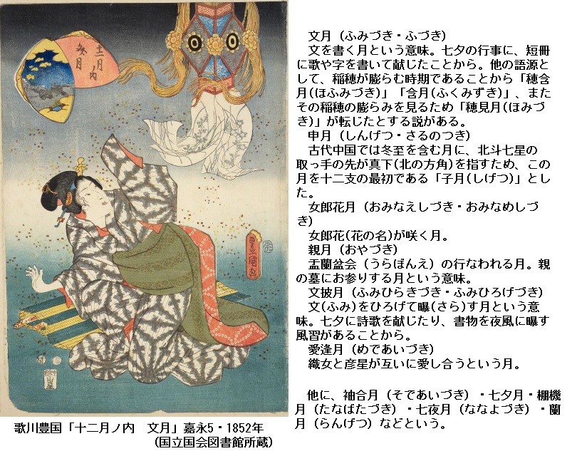 旧暦7月を文月(ふづき、ふみづき)と呼び、現在では新暦7月の別名としても用いています。文月の由来は、7月7日の七夕に詩歌を献じたり、書物を夜風に曝す風習があるからというのが定説となっているようです。しかし、七夕の行事は奈良時代に中国から伝わったもので、元々日本にはないものでした。そこで、稲の穂が含む月であることから「含み月」「穂含み月」の意であるとする説もあります。また、「秋初月(あきはづき)」、「七夜月(ななよづき)」の別名もあります。