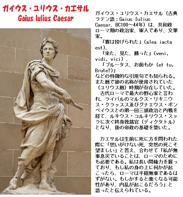 英語での月名、Julyは、ユリウス暦を創った共和政ローマ末期の政治家、ユリウス・カエサル(Julius Caesar)からとられたものです。カエサルは紀元前45年にユリウス暦を採用するのと同時に、7月の名称を「5番目の月」を意味する "Quintilis(クィンティーリス)" から自分の家門名に変更しました。
