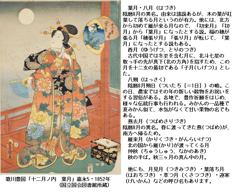日本では、旧暦8月を葉月(はづき)と呼び、現在では新暦8月の別名としても用いています。葉月の由来は諸説あります。木の葉が紅葉して落ちる月「葉落ち月」「葉月」であるという説が有名です。他には、稲の穂が張る「穂張り月(ほはりづき)」という説や、雁が初めて来る「初来月(はつきづき)」という説、南方からの台風が多く来る「南風月(はえづき)」という説などがあるます。また、「月見月(つきみづき)」の別名もあります。