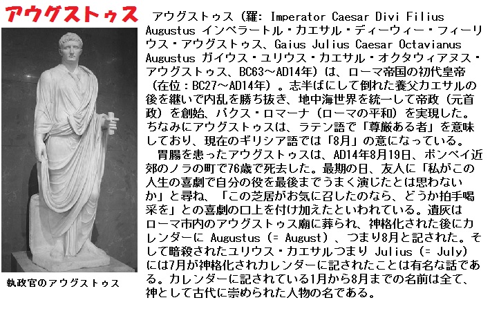 英語名Augustは、ローマ皇帝Augustus(アウグストゥス)に由来します。アウグストゥスは紀元前1世紀、誤って運用されていたユリウス暦の運用を修正するとともに、8月の名称を「6番目の月」を意味する "Sextilis(セクスティリス)" から自分の名に変更しました。