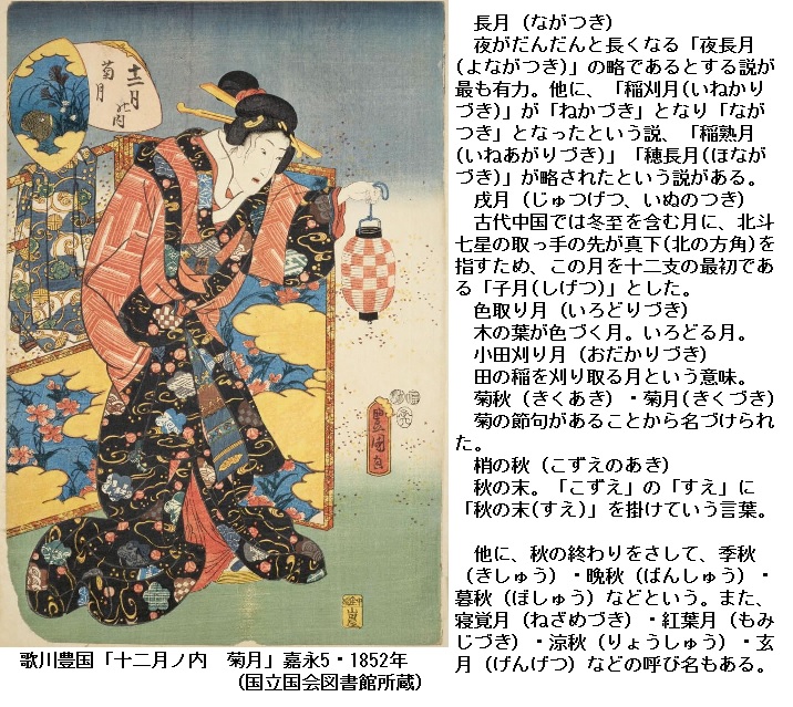 旧暦9月を長月(ながつき)と呼び、現在では新暦9月の別名としても用います。長月の由来は、「夜長月(よながつき)」の略であるとする説が最も有力です。他に、「稲刈月(いねかりづき)」が「ねかづき」となり「ながつき」となったという説、「稲熟月(いねあがりづき)」が略されたものという説などがあります。また、「寝覚月(ねざめつき)」の別名もあります。