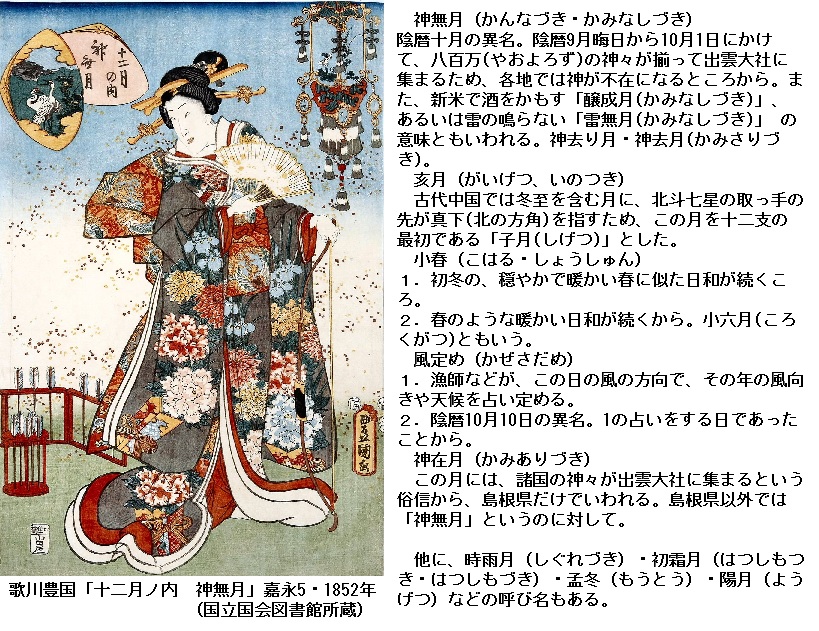 英語での月名、Octoberは、ラテン語表記に同じで、これはラテン語で「第8の」という意味の "octo(オクト))" の語に由来しています。一般的な暦では10番目の月ですが、紀元前46年まで使われていたローマ暦では、一般的な暦の3月が年始であり、3月から数えて8番目という意味です。日本では、旧暦10月を神無月(かんなづき、かみなしづき)と呼び、新暦10月の別名としても用います。