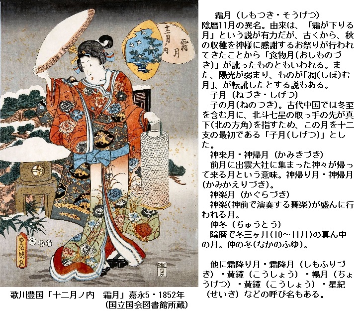 旧暦11月を霜月(しもつき)と呼び、現在では新暦11月の別名としても用いています。「霜月」は文字通り霜が降る月の意味です。他に、「食物月(おしものづき)」の略であるとする説や、「凋む月(しぼむつき)」「末つ月(すえつつき)」が訛ったものとする説もあります。また、「神楽月(かぐらづき)」、「子月(ねづき)」の別名もあります。英語での月名、Novemberは、「9番目の月」の意味で、ラテン語で「第9の」という意味の「novem(ノウェム)」の語に由来しています。実際の月の番号とずれているのは、紀元前46年まで使われていたローマ暦が3月起算で、3月から数えて9番目という意味なのです。