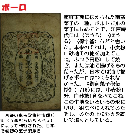 3.ボーロ (葡: bolo) とは、ポルトガル語においてはケーキを主とする菓子の総称であり、特定の菓子の名前ではありませんが、日本においては小麦粉、砂糖、卵、牛乳を材料とした南蛮焼き菓子のことをいいます。日本には16世紀に伝えられ、江戸時代の『古今名物御前菓子秘伝抄』などの菓子の製法書に製法が残されていますが、当時の材料には卵は用いられていませんでした。次第に材料に胡麻や大豆などを用いる工夫も重ねられ、造形も王冠、あるいは花びらのような形に成形された花ぼうろとして親しまれていた様子が『名代干菓子山殿』や『小紋裁』に記述されていますが、成形の手間などから次第に廃れ、現在その痕跡は沖縄県の花ぼうるとしてみるに留めます。これは他のボーロと異なり複雑な形をしていて、食感はクッキーに近いもののようです。現在では小麦粉の他にもそば粉や片栗粉を主原料とし、卵、砂糖などを加えてこね、成型してから焼き上げられます。一般的にはカリッとした軽い歯ざわりと口中でさらりと溶ける食感が特徴ですが、中にはカステラのようにしっとり焼き上げたものもあります。 形としては丸めてから平たくしたものや、小粒のものなど様々であり、販売される商品名も「乳ボーロ」「丸ぼうろ」「たまごボーロ」「ミルクボーロ」「ベビーボーロ」「そばぼうろ」「松葉ボーロ」(島根県津和野町など。「松葉」と呼ばれることも)「堅ボーロ」(滋賀県長浜市)など様々な名称で広く市販されています。 「丸ぼうろ」は佐賀市の銘菓であり、佐賀をはじめとする九州の土産菓子として有名です。