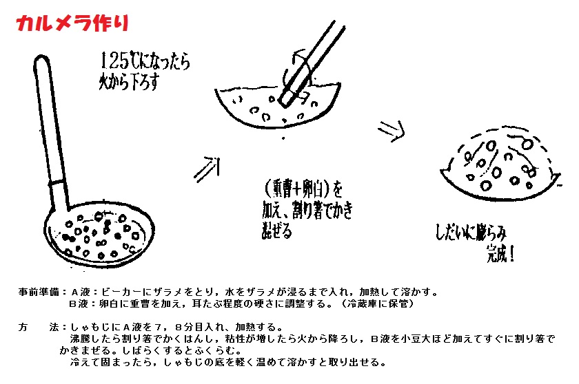4.カルメラ(葡: caramelo)はカルメ焼き、かるやきとも呼ばれています。いわゆる駄菓子の一種で、今日でもお祭や縁日の露店などで稀に見掛けることができます。直径は10cmほど、厚みは4~5cmほどの「亀の甲羅」に似た中央が膨らんだ楕円状の菓子である。発泡させた飴のようなモノでもあり、サクサクした歯応えと濃厚な甘さ、加えてカラメルのような砂糖の焦げた風味があります。語源はポルトガル語の「甘いもの」(caramelo)によります。作るには砂糖を融かす熱源と砂糖を融かす型、そして攪拌するための割り箸や菜箸のような棒があればよいのです。材料は水・砂糖・重曹(膨らし粉)です。爺も子供の頃、おたまの中にザラメ砂糖を入れてガス代に載せて溶かし混ぜ棒の先に重曹をつけて素早くかき混ぜ、混ぜ棒を少しばかり持ち上げると溶けたザラメが膨らんでカルメ焼きが出来上がり、それをおやつに食べていたのを思い出します。作り方は単純で、ザラメまたは赤砂糖(三温糖)に少量の水を加え加熱して融かし、125℃になったら重曹を加えて手早くかき混ぜ、炭酸ガスで発泡したところで、冷やしながら軽石状に固めたものです。古くは重曹の代わりに卵白を用いていたといいます。ただ、砂糖と水の分量や、火から下ろすタイミング次第では失敗することがあります。冷やす際には、水に濡らしたタオルの上に形を押し当てながら、溶けた砂糖が発泡状態のまま固まるようにさせます。