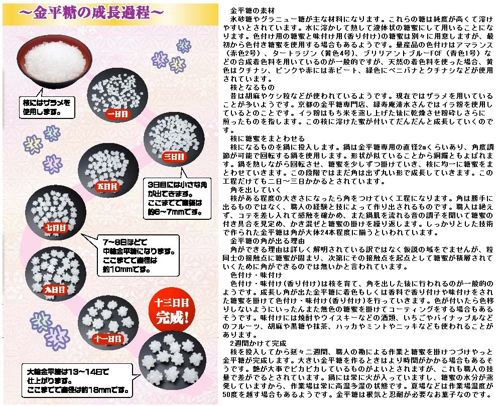 6.コンペイトウ(葡: confeito)は、戦国時代にポルトガル人が西日本へ来航し、南蛮の諸文物がもたらされました。永禄12(1569)年にキリスト教・宣教師のルイス・フロイスが京都の二条城において織田信長に謁見した際に、献上物としてろうそく数本とフラスコ(ガラス瓶)に入った金平糖が差し出されたといわれています。江戸時代初期には慶長14(1609)年に佐賀藩の『坊所鍋島文書』に「金平糖一斤(600グラム)」が記されており、慶長18(1613)年に平戸の松浦鎮信の病気見舞いに贈られたといいます。さらに、寛永14年(1637年)の長崎・平戸のオランダ商館長日記に拠れば、ポルトガル船により「各種金平糖3000斤(1800キロ)」が運ばれており、京都などに流通して献上品として用いられていたといいます。江戸中期の元禄元(1688)年に刊行された井原西鶴の『日本永代蔵』の中で長崎において金平糖作成を試みる話が記されており、中国人もその製法を知っていたといいます。なお、西日本では佐賀藩で元禄3(1690)年から三度に渡る贈答の事例があります。18世紀には、庶民の間にも普及していたようです。