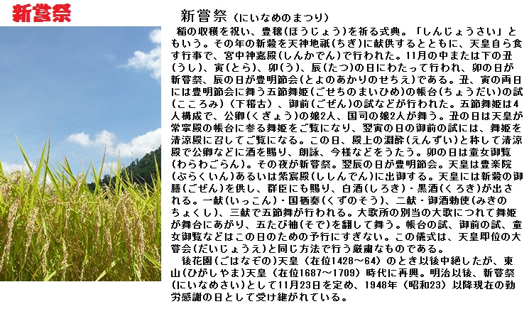 勤労感謝の日が制定される以前は、「新嘗祭」が行われていました。新嘗祭は古くから国家の重要な行事であり「瑞穂の国」の祭祀を司る最高責任者である大王〔おおきみ〕(天皇)が国民を代表して、農作物の恵みに感謝する式典でした。「新嘗」とはその年収穫された新しい穀物のことをいいます。農業中心の時代、この行事はとても重要な儀式でした。