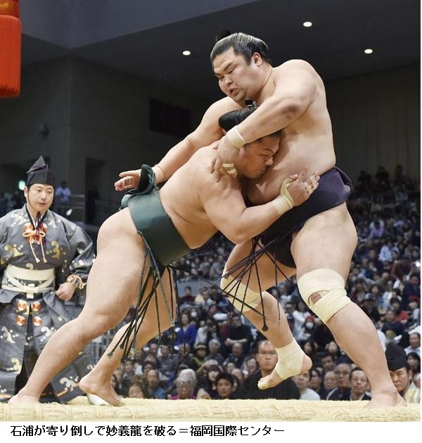 破竹の十連勝:新入幕の石浦は身長173センチ、体重114キロ、幕内では最軽量の力士です。持ち味は、素早い立ち合いと思い切りの良い相撲。23日の11日目に、元関脇の実力者・妙義龍にも勝ち、2日目から破竹の10連勝。11日目を終えて、横綱鶴竜らと優勝争いする活躍に、観客からの期待は高まっています。大活躍の石浦は、この九州場所から横綱白鵬の露払いを務めています。横綱土俵入りの露払いと太刀持ちは、同じ部屋か一門の幕内力士が務めるのが慣例になっています。十両に返り咲いた山口が幕内に入り、石浦が幕内で相撲を取り続ければ、夢は現実になります。