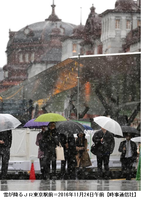 都心11月積雪、史上初=鉄道一部に乱れ-関東甲信、大雪注意 ―― 関東甲信では24日午前、雨や雪が降った。東京都心では初雪となり、北の丸公園で午前11時に気象庁職員が積雪を観測した。都心の11月の積雪は1875年の統計開始以来初めて。気象庁は昼すぎにかけて関東の山沿いと甲信で大雪となり、関東の平野部でも雪が積もる所があるとして、交通の乱れや路面の凍結などに注意を呼び掛けた。