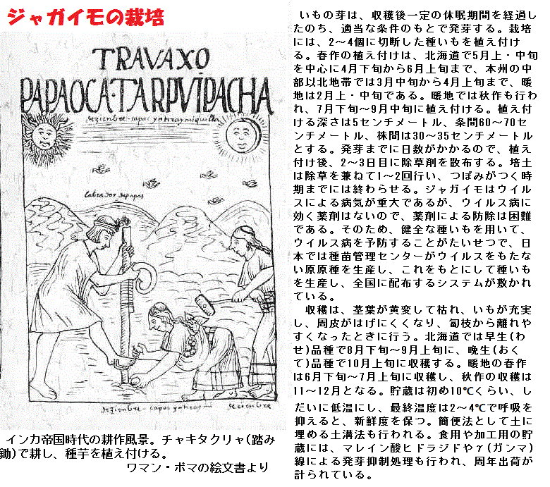 現在広く栽培されるジャガイモは四倍種で、アンデス山岳地帯のペルーとボリビアにまたがる標高4000メートルにあるティティカカ湖周辺で、西暦500年ころに栽培されていたものです。