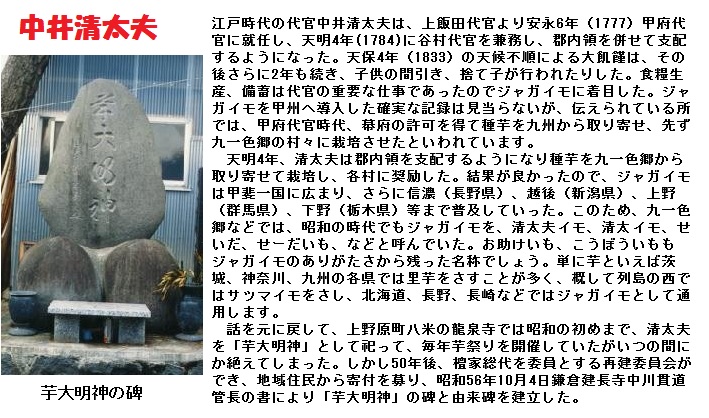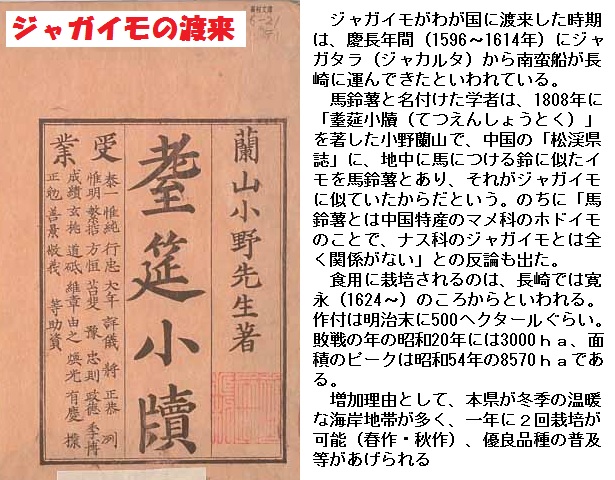 寛政(かんせい)年間(1789~1801年)にはロシア人が北海道や東北地方に伝え、エゾイモの名で東北地方へ広がっりました。日本でも最初はヨーロッパ同様観賞植物扱いでしたが、その後飢饉(ききん)のたびに食糧として関心が高まりました。甲斐(かい)(山梨県)代官中井清太夫(せいだゆう)の尽力により、食糧難を乗り越えたことから「清太夫いも」の名でよばれたこともあるなど各地に逸話が残っています。