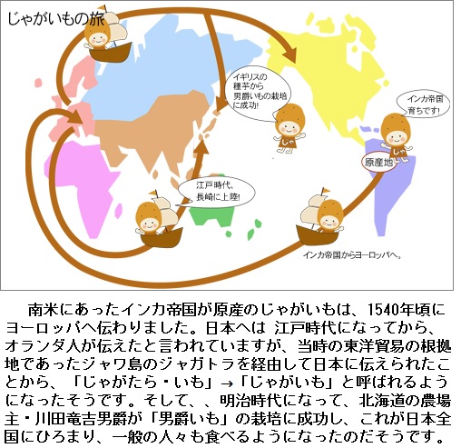 旧大陸へは、1570年にメキシコからスペインに導入され、16世紀に広くヨーロッパの北方の国々に伝播しました。イギリスにはこれとは別に1590年に導入、北アメリカには1621年にヨーロッパから導入されました。インドには16世紀に、インドネシアや中国には16世紀にオランダ人により導入されたそうです。日本には1601(慶長6)年に、ジャカトラ港(現在のジャカルタ)からオランダ船によって長崎県の平戸(ひらど)に運ばれたのが最初で、ジャガタライモと名づけられました。それが略されてジャガイモとよばれるようになったそうです。