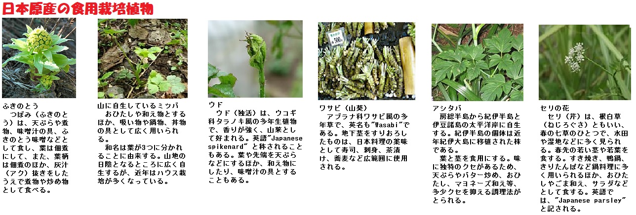 日本原産とされる野菜で、確実なのは、フキ・ミツバ・ウド・ワサビ・アシタバ・セリぐらいです。