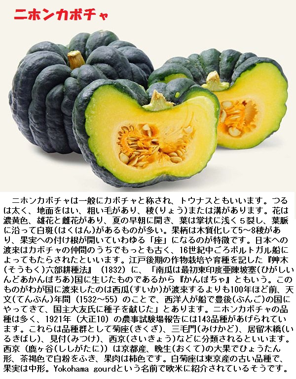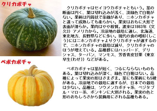 ウリ科の一年生つる草、カボチャ属の野生種は新大陸のみに分布し、その多くはメキシコおよび中央アメリカで、11種に及ぶといいます。栽培種5種のうちニホンカボチャ、クリカボチャ、ペポカボチャは世界で広く栽培されています。