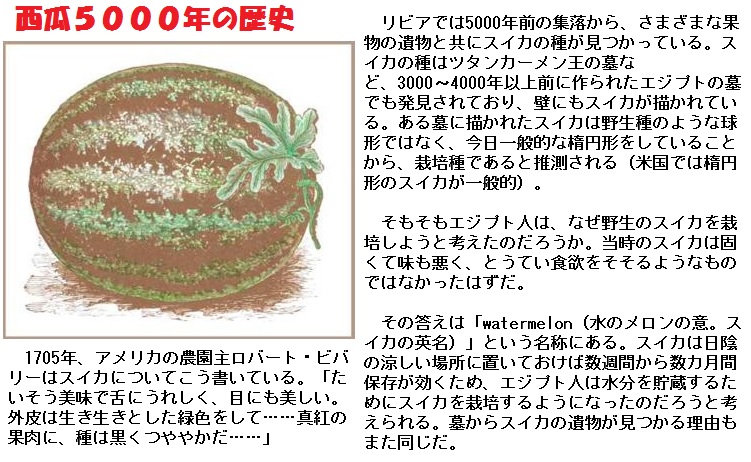 なおスイカも南蛮人によって、日本へ持って来られたものです。西域(今の中央アジア)より渡来したので、西瓜でスイカ(唐音)と言います。大阪ではそのままサイカと言ったそうです。言語を伝えていませんが、おそらく最初は原語のまま呼ばれていたのではないでしょうか。