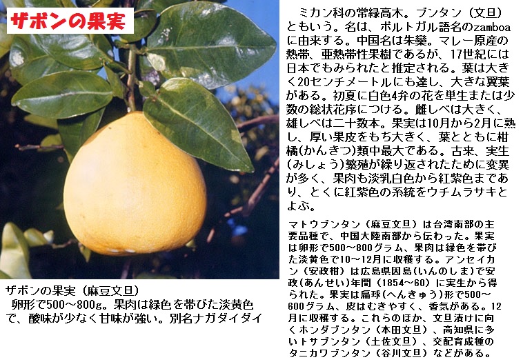 今から240年前(安永元年・1772年)に吹き荒れた春一番により、唐船(中国福建の船)が薩摩の阿久根に漂着しました。地元のあたたかいもてなしと物心両面の援助と協力により応急の修理も終わり、食料や飲料水を積み込んで目的地の長崎に向かいました。この際お礼にと船内に僅かに残っていた2個の朱欒(シュラン)、白欒(ハクラン)を唐通詞の原田喜右エ門に贈りました(朱欒は果肉の色が赤、白欒は果肉の色は白色・黄色)。このミカン(当時温州みかんはすでに渡来していました)の化物みたいな果実を番所の役人達は神妙に食べ、数人の役人達はその種子を持ち帰って自分の屋敷に播いて育ててみました。その種子から育った木に実ったミカンの王者を見て、昔お礼にと二個の果物を恥かしげに渡して去った船長の名(謝文旦)を思い出し、上二個の謝文(ザボン・またはジャボン)とか、下二字の文旦(ボンタン又はブンタン)と呼ぶようになったと伝えられているそうです。中国ではボンタンの事を柚子(日本の柚子とは別)と呼ぶそうです。