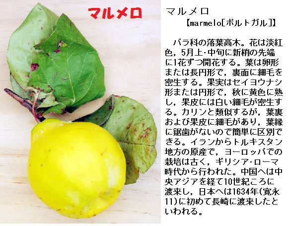 マーマレードは、オレンジなどの柑橘類の果実を原料としたものですが、ポルトガルで最初に作られたときの原料は marmelo(マルメロ、ポルトガル語、英語ではquince〈クインス〉)であったといいます。