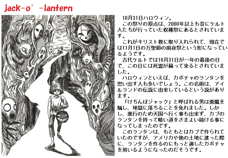 この明かりに関しては時に男性の名前が代わって「will-o'-the-wisp(ウィル・オー・ザ・ウィスプ、世界各地に存在する、鬼火伝承の名の一つ)」と呼ばれる事もあり、多種多様な話、呼び名があって各教会ごとに脚色したり、本として出版するときに話が増えたと考えられています。日本にも「狐火」や「鬼火」といった不思議な光の話は数多くあります。最初はカブだったランタンも、アメリカで作られたカボチャのランタンが普及し、今では「カボチャランタン」が一般的な「ジャック・オー・ランタン」になっています。